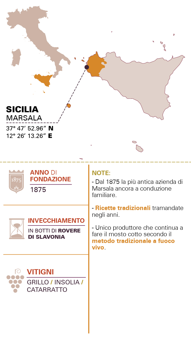 TIPOLOGIADOC Marsala ZONA PRODUTTIVAZona costiera della Sicilia occidentale MATERIA PRIMAGrillo, Cataratto e Inzolia VITIGNOGrillo, Cataratto, Inzolia TIPOLOGIA DEL TERRENOTerre rosse, ricche di ferro e povere di materiale organico, sabbiose, ciottolose e poco permeabili. VINIFICAZIONELe uve vengono raccolte manualmente. Fermentazione a temperatura controllata e preparazione della concia attraverso l’aggiunta, al vino ottenuto, di mistella (mosto fresco addizionato di alcol da vino), mosto cotto (mosto fresco concentrato a fuoco diretto), e distillato di vino SISTEMA DI ALLEVAMENTOSpalliera COLOREAmbrato PROFUMOAl naso è intenso, richiama note di panificazione, torta in casa, vaniglia, cedro e fichi secchi,frutta candita e caramello. ABBINAMENTIMolto adatto in cucina, per la preparazione delle carni.Ottimo in abbinamento a diverse tipologie di dessert e pasticceria secca. Da urlo con una crema pasticcera di mandorla servita al cucchiaio. SAPOREAl palato si presenta morbido, elegante e pieno, ricco di sfumature in via di evoluzione. INVECCHIAMENTOOltre 1 anno in botti di rovere di Slavonia da 100 e 150 hl.