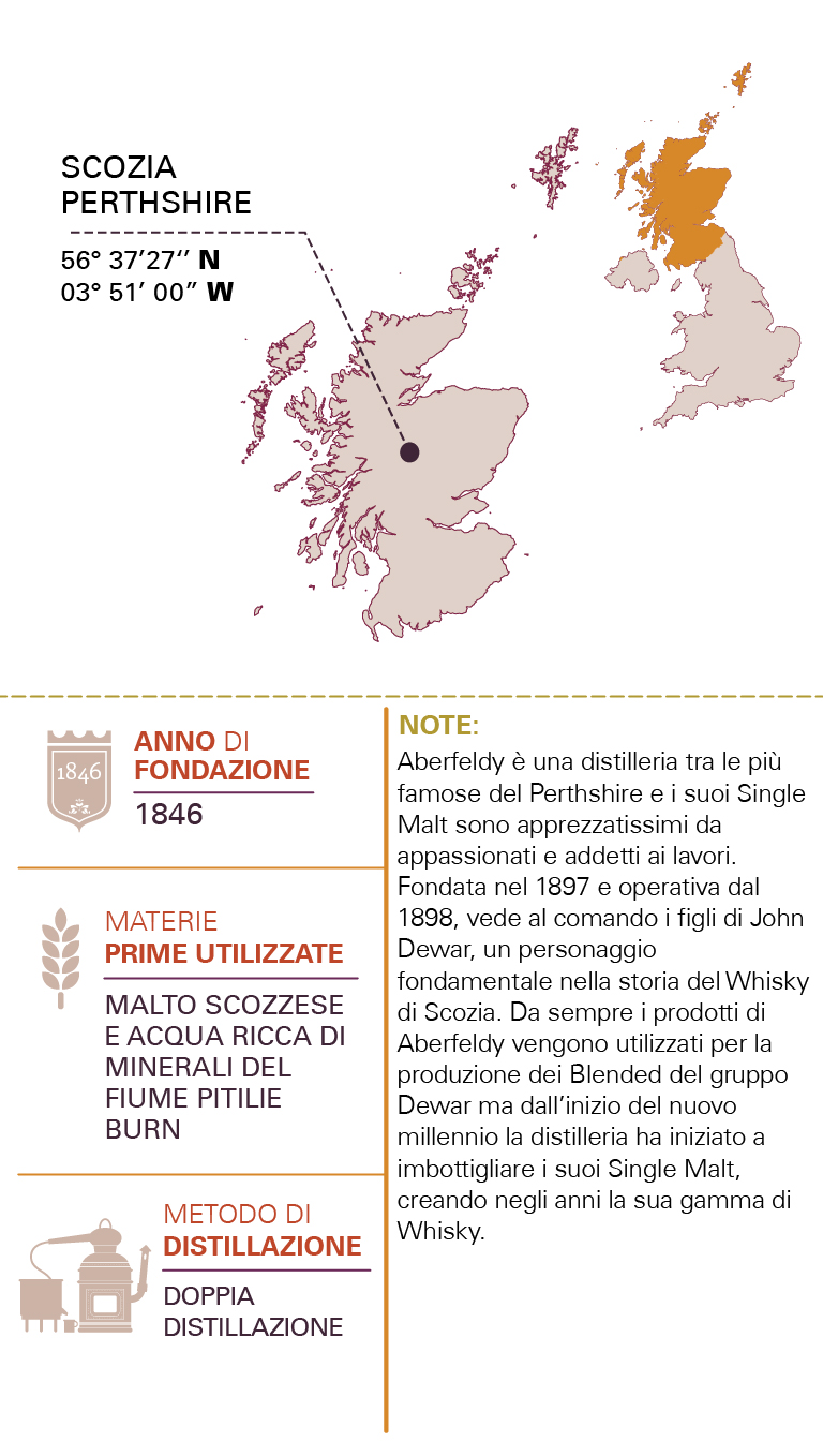 ZONA PRODUTTIVAHighlands MATERIA PRIMAOrzo, acqua, lievito DISTILLAZIONEDoppia distillazione in alambicchi in rame Pot Still COLOREOro intenso con riflessi gialli PROFUMOAl naso è dolce, con note mielate arricchite da ricordi speziati, di agrumi e da un tocco di vaniglia. SAPOREAl palato è rotondo e delicato, con le stesse note percepite al naso che emergono con eleganza. Il finale è morbido e dolce. NOTEAberfeldy è una distilleria tra le più famose del Perthshire e i suoi Single Malt sono apprezzatissimi da appassionati e addetti ai lavori. Fondata nel 1897 e operativa dal 1898, vede al comando i figli di John Dewar, un personaggio fondamentale nella storia del Whisky di Scozia. Da sempre i prodotti di Aberfeldy vengono utilizzati per la produzione dei Blended del gruppo Dewar ma dall’inizio del nuovo millennio la distilleria ha iniziato a imbottigliare i suoi Single Malt, creando negli anni la sua gamma di Whisky. INVECCHIAMENTOInvecchiamento di 12 anni in botti di quercia First Fill di Sherry e di Bourbon, in botti Refill di Aberfeldy e Re-char (ringiovanite attraverso una nuova tostatura).