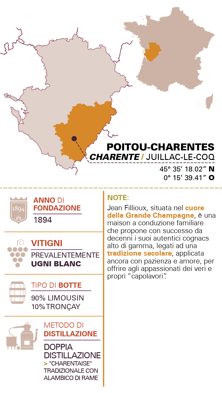 • NOTEJean Fillioux situata nel cuore della Grande Champagne è una maison a conduzione familiare che propone con successo da decenni i suoi autentici cognacs alto di gamma, legati ad una tradizione secolare applicate ancora con pazienza e amore, per offrire agli appassionati dei veri e propri capolavori.