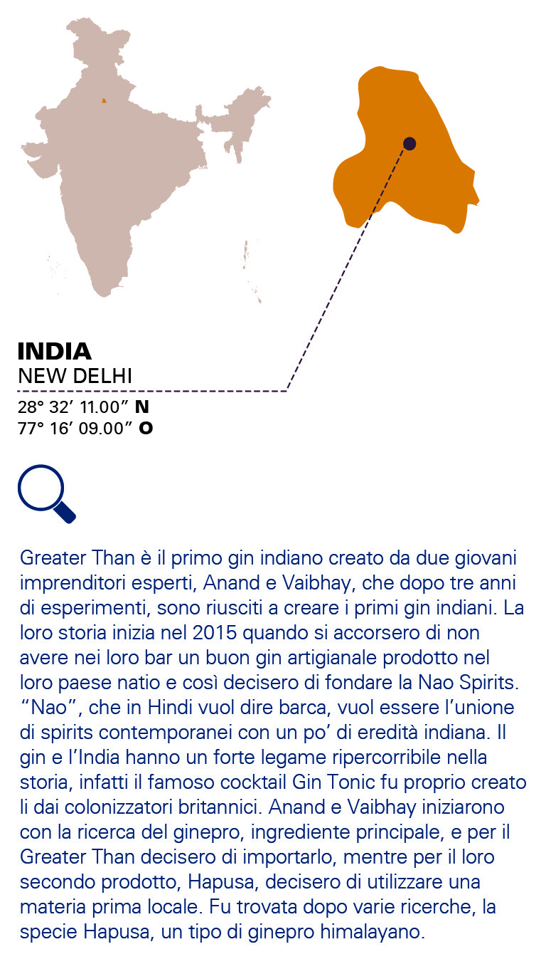 • NOTEGreater Than è il primo gin indiano creato da due giovani imprenditori esperti, Anand e Vaibhay, che dopo tre anni di esperimenti, sono riusciti a creare i primi gin indiani. La loro storia inizia nel 2015 quando si accorsero di non avere nei loro bar un buon gin artigianale prodotto nel loro paese natio e così decisero di fondare la Nao Spirits. «Nao», che in Hindi significa barca, vuol essere l’unione di spirits contemporanei con un po’ di eredità indiana. Il gin e l’India hanno un forte legame ripercorribile nella storia, infatti il famoso cocktail Gin Tonic fu proprio creato lì, dai colonizzatori britannici. Anand e Vaibhay iniziarono con la ricerca del ginepro; per il Greater Than decisero di importarlo, mentre per il loro secondo prodotto, Hapusa, decisero di utilizzare la materia prima locale, Hapusa, un tipo di ginepro himalayano trovato dopo varie ricerche.