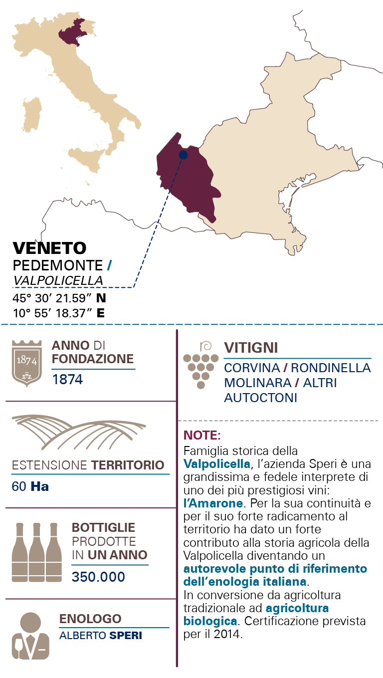 • ZONA PRODUTTIVADi proprietà dell'azienda Speri, dislocati in Valpolicella Classica tra i 120 e i 350 m./s.l.m. e precisamente nei comuni di San Pietro in Cariano, Fumane e Negrar.